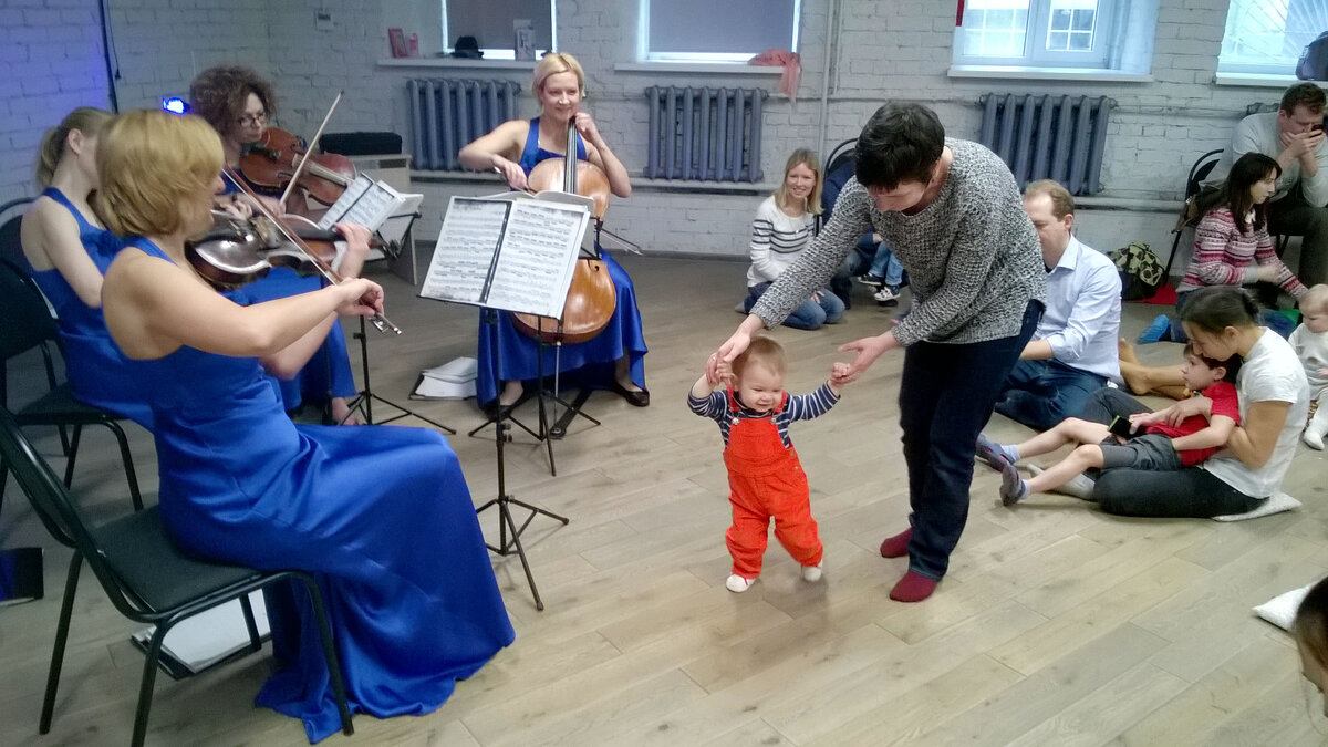 Мы со старшим сыном начали посещать светские мероприятия в возрасте 11 месяцев. Наш первый выход — концерт, организованный проектом "Вместе с мамой". "Вместе с мамой" организуют концерты для мам и малышей на разных столичных площадках. Туда приглашают профессиональных музыкантов, и, как следствие, исполнение на очень высоком уровне. Мы были на таких концертах трижды. Публика там — от новорожденных до примерно пяти лет. Все зрители сидят на полу либо свободно перемещаются по залу. Сцены как таковой нет, она — импровизированная. Музыку играют простую, понятную и прекрасную — Моцарта, Чайковского. После выступления музыканты позволяют деткам потрогать инструменты. Всякий раз мне казалось, что для такой взыскательной и благодарной публики музыканты очень стараются. Сын мой всякий раз слушал завороженно.