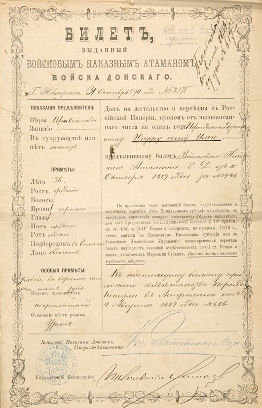 Недавно нашел на работе восхитительную вещицу. Я такие очень люблю. Зацените! Это аналог современных рабочих виз или видов на жительство. очень любопытная вещица. Документ от 1890 года. В нем указано, что он выдан персидскоподданому Юсуфу сыну Илии на работу и переезды по территории Российской Империи. Как и в некоторых современных документах, в билете указано семейно положение, род занятий, приметы и особые приметы (для сотрудников контроля, очевидно), ну и, как дань времени, вероисповедание. Например, господин Юсуф из Персии был православным, женатым мужчиной 36 лет (на 1890 год), среднего роста, с черными волосами и глазами, обычным (!) лицом и без одного зуба в верхней челюсти.