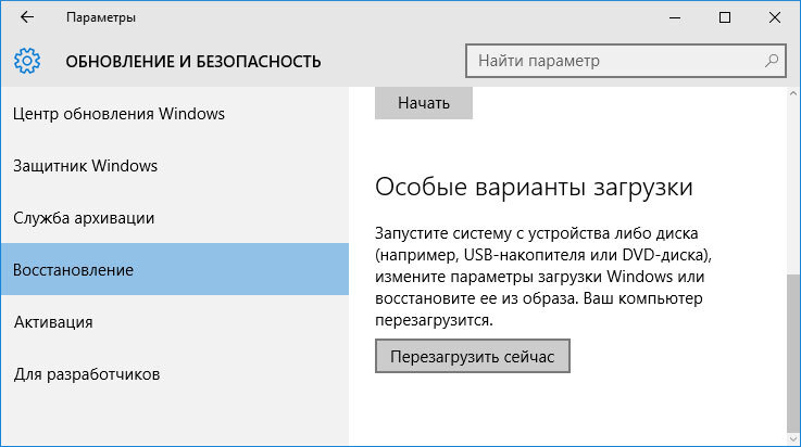 - В разделе Восстановление найдите Особые варианты загрузки и нажмите кнопку Перезагрузить сейчас.