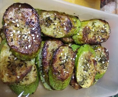 Кабачки. Многими любимый овощ. Очень вкусные свежие сырые молодые кабачки. Их можно употреблять в пищу тертыми к салатам, можно просто нарезать дольками тонкими, маслом подсолнечным приправить. Вкусно и полезно. Кабачок не каллориен. На 100 гр всего 24 ккал. В нем много витаминов А, Е, В1, В2, В6, С, РР, фосфор, магний, железо, натрий, кальций. Но больше всего в нем калия. Поэтому тем, кто страдает гипертонией и употребляет лекарственные средства от этой болезни, как правило, на постоянной основе, нужно употреблять кабачки, чтобы поддерживать баланс калия в организме. Кто не сыроед, тому подойдет рецепт очень быстрого приготовления кабачков. Подавать можно и как закуску, можно использовать как основу к горячим бутербродам. 1. Нарезаем вымытые кабачки дольками, толщиной в 1 см. Не солим. 2. На разогретую сковороду наливаем подсолнечное масло, подогреваем его немного. Укладываем кабачки и накрываем крышкой. Огонь делаем средний. Обжариваем с двух сторон, не обязательно до румяной коро