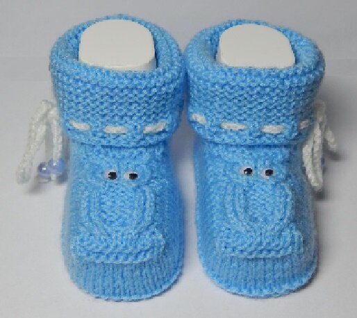 Как вязать такие пинетки? Аналогично предыдущим. Только сову вывязывать не нужно, вяжем на её месте лицевой гладью и пришиваем или приклеиваем нос и глаза. Манжеты вяжем не платочной вязкой, а резинкой 1 лиц., 1 изн. Шнурок вставляем не на отвороте манжеты, а сразу над пяточкой. Ушки вяжем отдельными детальками и пришиваем в нужном месте этими же нитками.