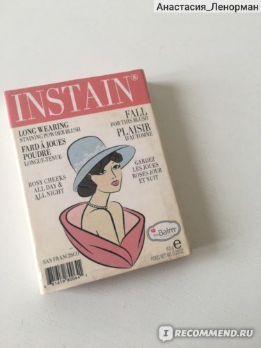 Этот бренд я люблю очень давно и верно. Марка уже давно зарекомендовала себя как отличный производитель качественной косметики, с очаровательным дизайном в стиле Pin-up. Соответственно такое качество и оформление не может стоит 200р, но отдавая 1500-3000р, ты точно понимаешь за что платишь. Я пользовалась многими продуктами от данного бренда и вот пришло время румян. Стойкие компактные румяна INSTAIN от THE BALM – продукт известного американского бренда. Нежная пудовая текстура средства наделена насыщенным пигментом, который легко адаптируется к естественному цвету кожи. Таким образом создается эффект природного румянца. Стоимость моно-румян - 1500-2000р. Вес - 6,5гр. Достаточно много для румян, с их мизерным расходом (но не буду забегать вперед) Продукты с сухими текстурами идут с защитой, дублируя дизайн самого "футляра". Этот факт не может не радовать, так как моя косметика кочует по всем сумкам в спартанских условиях не всегда в косметичке. Каюсь. Когда я только познакомилась с э