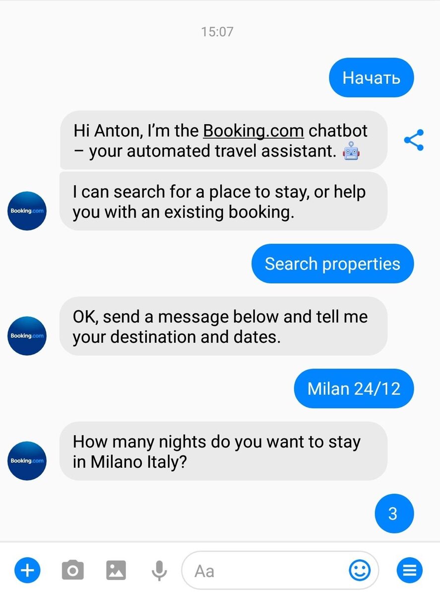 Представьте, что случилось непоправимое: ваша бронь отеля отменилась, а вы уже в пути. Как быстро найти другой вариант проживания? Можно самому рыскать по booking.com в поисках отеля, а можно попросить их бота помочь! Чатбот обитает в Facebook Messenger и пользоваться им очень легко. Просто нажмите на кнопку с изображение молнии на официальной странице booking.com в социальной сети и начните чат с компанией. Вас поприветствует англоязычный чат-бот, который расскажет о своих возможностях: помощи в поиске места для ночлега и бронировании жилья. Затем автоматизированный ассистент попросит вас выбрать место отправления и дату заселения. Например, почему бы не съездить в декабре в Ломбардию? Выбираем Милан и трое суток проживания, начиная с 24.12. Бот выдаёт свободные варианты, и предлагает упростить выбор, применив фильтр. Так как предложенных вариантов слишком много, соглашаемся и за основу выдачи просим взять количество звёзд. Теперь к нашим услугам самые шикарные и дорогие апартамен