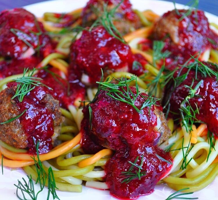 1. Лук и зелень измельчить. Смешать фарш, лук, муку и яйцо. Слепить тефтели. 2. Готовить на пару 20-25 минут или запечь в духовке при температуре 170° 20-25 минут (в зависимости от размера). 3. Бруснику измельчить в блендере. Добавить подсластитель. Варить на медленном огне 5 минут, периодически помешивая. Приятного аппетита!