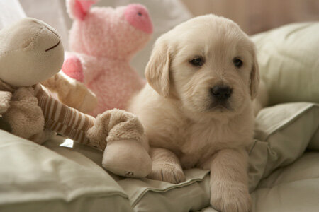 Подстилку нужно выбирать по размеру щенка, но с запасом, учитывая, что щенок растет быстро. Материал желательно выбрать такой, который легко чистится или стирается в машинке. Миски надо выбирать по размеру щенка и желательно на подставке — их можно регулировать по высоте под рост щенка. Будьте готовы к тому, что по мере роста щенка вам придется поменять миски на более объемные. Пеленки пригодятся на время карантина щенка после прививки и для приучения к туалету. Поводок и ошейник тоже лучше приобрести заранее, и пока щенок находится дома на карантине постепенно приучать к ним. Для более правильного формирования костяка лучше первое время водить щенка на шлейке. Выбор игрушек для щенка тоже не прост. В первую очередь они должны быть безопасными, а значит, без мелких деталей, которые легко отгрызаются и проглатываются. Очень внимательно следите за щенком, если дали ему мягкую игрушку: в любой момент он может отгрызть у нее нос и глазки и проглотить, а также распотрошить ее,
