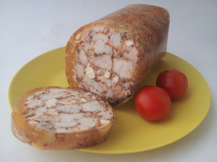Блюдо отлично дополнит праздничное меню и будет прекрасно смотрится на ломтике хлеба – такой бутерброд можно подавать к завтраку или ланчу. Ингредиенты: орехи грецкие – 100 г; чесночные зубки – 2 шт.; курица; специи; желатин – 30 г; Способ приготовления: Чеснок почистить и измельчить при помощи чеснокодавки. Курицу отварить в подсоленной воде, затем вынуть из бульона и нарезать на средние кубики. Выложить нарезанную курицу на сухую сковороду и слегка подсушить (огонь должен быть медленным). Спустя 5 минут приправить специями и солью, накрыть крышкой и продолжать тушить ещё 5 минут, затем снять с огня и остудить.. Желатин развести в теплой воде, перемешать до полного растворения, смешать с курицей, чесноком, порубленными орехами и бульоном. Перемешать массу и выложить в пластиковую бутылку, охладить блюдо до полного остывания, после закуску можно подавать. ПРИЯТНОГО АППЕТИТА! Если Вам понравилась статья, ставьте лайк и подписывайтесь на