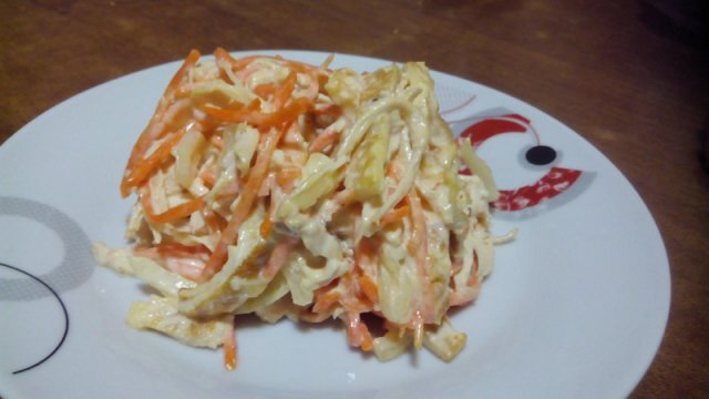 Майонез 6 ст. л. Салат «Василиса» скорее всего займёт место одного из самых обожаемых блюд в вашей семье. Оригинальное сочетание ингредиентов, удивительные вкусовые качества и питательность этого салата не оставят никого равнодушным. Приготовление салата «Василиса»: Прежде всего необходимо замариновать лук. Нарезать полукольцами и залить уксусом, водой, добавить соль и сахар. Отставить мариноваться 20-30 минут. Куриную грудку разделить на волокна. Из яиц готовим 4 омлетика. Каждое яйцо разбить, размешать, можно слегка подсолить и отправить на сковороду, обжарить с двух сторон. И так с каждым яйцом. После остывания нарезать тонкими полосками. Соединяем все ингредиенты в широкой посуде: морковь, грудку, омлет, маринованный лук и майонез. Перемешивать лучше двумя вилками. Дать салатику пропитаться. Приятного аппетита! А больше вкусных и полезных рецептов вы найдете на нашем сайте https://retsept-prigotovleniya.ru/