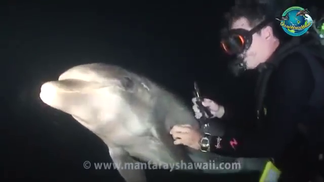 Всем известно, что дельфины являются самыми умными животными в мире. Они не раз спасали тонущих людей и даже известны случаи, когда сами просили о помощи. Эта история произошла на Гавайских островах у побережья острова Кона. Группа дайверов совершали ночное погружение, взяв с собой видеокамеру и освещение для наблюдения за скатами. В один из моментов их внимание привлек, проплывавший рядом дельфин, который своими необычными движениями пытался что-то донести до ныряльщиков. Когда дайверы подплыли поближе, они обнаружили на плавнике намотанную толстую леску.Явно, что она сковывала ему движения и мешала плавать. Дельфин как бы просил о помощи и дайверы стали предпринимать усилия по освобождению плавника от намотанной в несколько оборотов лески. Дельфин вел себя спокойно и старался плыть медленно, давая возможность пловцам оказывать помощь. У дайверов было хорошее световое подводное оборудование, дававшее превосходное освещение и видимость под водой. Кроме впившейся в тело рыболовной леске