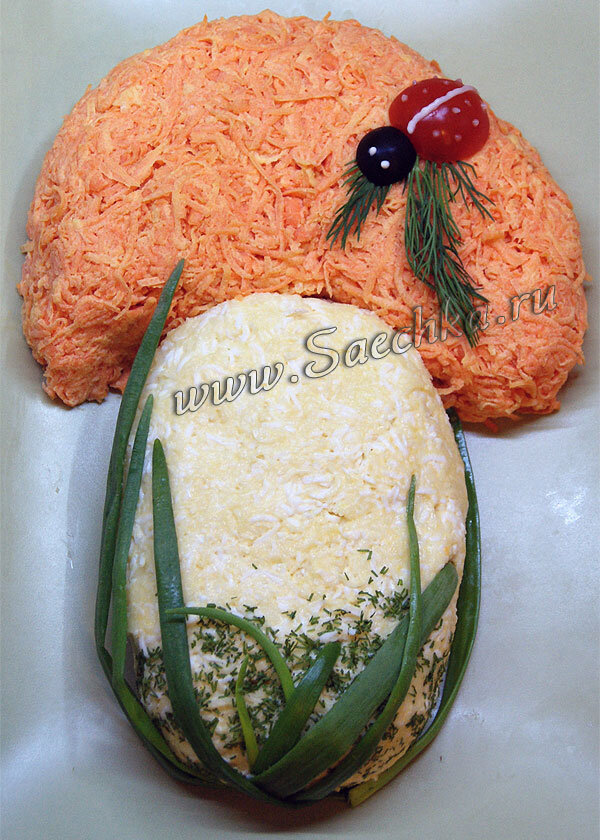 - Сырую морковь натереть, добавить измельченный чеснок и майонез. Перемешать. Выложить на тарелку в виде "шапочки" гриба.