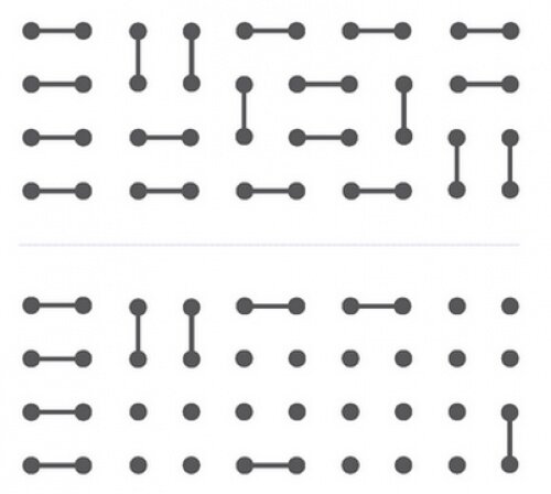 Запоминайте в течение минуты расположение точек и линий в первых четырех строках. Затем, не глядя на них, добавьте недостающие линии в нижних четырех строках.
