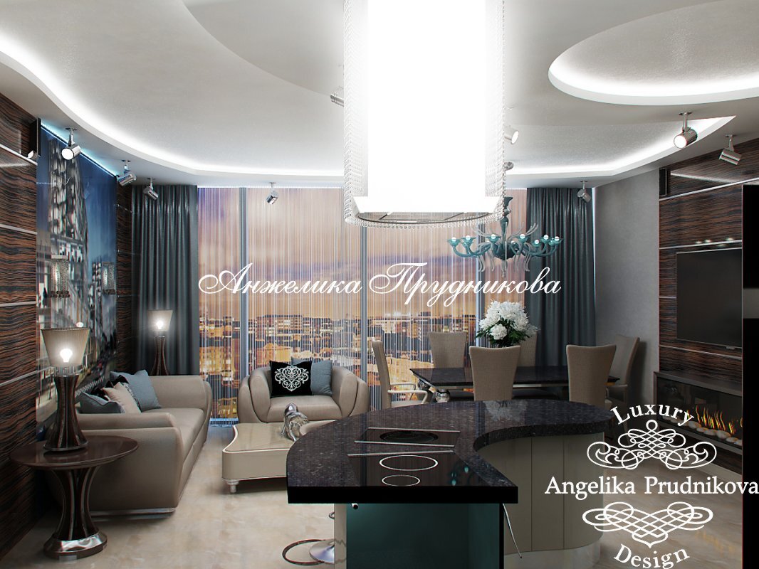 Просторный лофт, объединяющий гостиную, столовую и кухню, закрыт от прихожей деревянной перегородкой, которая переходит в элегантную полукруглую барную стойку. Она отделяет пространство небольшой, но удобной кухни от столовой зоны и гостиной. Узоры из тёмного резного камня на светлом мраморном полу создают движение, приглашая пройти в гостиную. Здесь много света и воздуха, как за счёт большого окна, оформленного светлыми портьерами, так и за счёт настенного панно, которое визуально расширяет пространство. Центр помещения определяет круглая ниша с неоновой подсветкой и люстрой в стиле хай-тек. Современные светильники зонируют помещение и создают возможность изменять освещение в зависимости от ситуации и настроения. Ванная комната отделена от спальни при помощи прозрачной перегородки, что делает это пространство просторным и светлым. Важный элемент современного жилища комфортная и просторная гардеробная комната отделана в том же стиле, что и все остальные помещения. В лаконичном сти