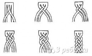 Схема плетения косички из четырех ниток. По такому же принципу можно сплести из любого четного числа ниток (шести, восьми, десяти, двенадцати, четырнадцати и так далее). На каждом шаге мы берем две центральные нитки, левую переносим на правый край, а правую на левый, и так плетем. Схема плетения косички из пяти ниток (шнур аксельбант). Опять же по этой схеме плетения можно сплести из любого нечетного количества нитей (семи, девяти, одиннадцати, тринадцати, пятнадцати и т.д.). Суть этой схемы в том, что мы берем левую нитку и перемещаем в центр, затем правую перемещаем в центр и повторяем нужное количество раз.