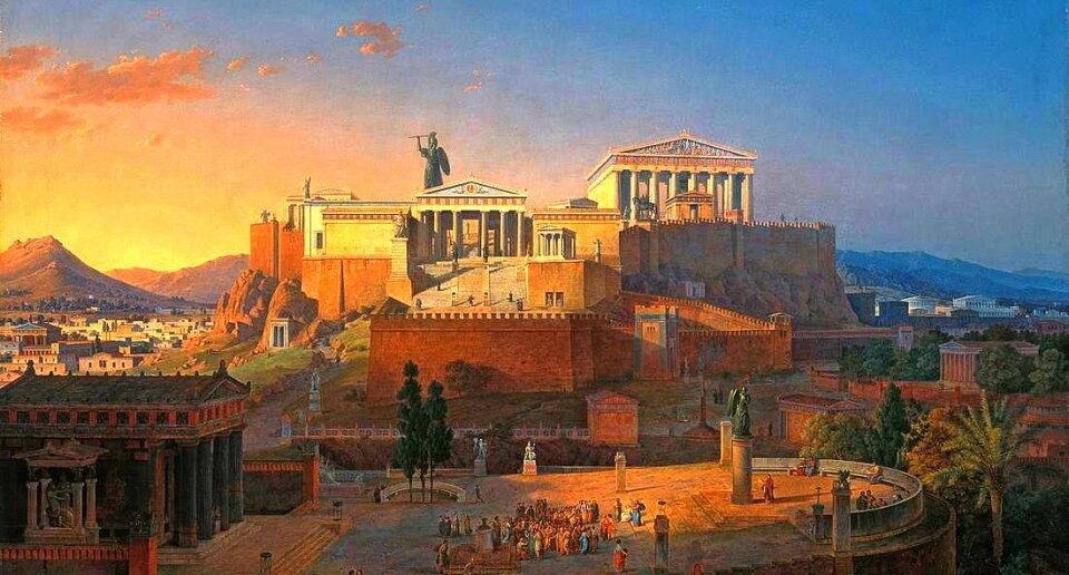 Во времена так называемого” греческого Средневековья " до Архаического периода люди жили разбросанными по всей Греции в небольших фермерских деревнях. По мере их роста эти деревни начали развиваться. Некоторые стены построены. Большинство построили рынок (Агора) и место встречи сообщества. Они развивали правительства и организовывали своих граждан в соответствии с какой-то Конституцией или комплексом законов. Они собрали армии и собирали налоги. И каждый из этих городов-государств (известных как poleis), как говорят, был защищен определенным Богом или богиней, которым граждане полиса были обязаны большим почтением, уважением и жертвенностью. (Например, божество Афин было Афина, так же как и Спарта.)