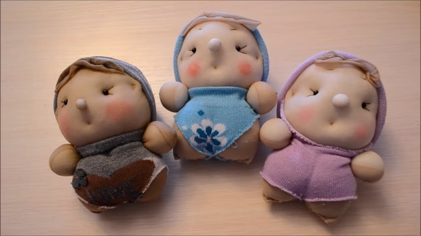 Из этой статьи вы узнаете, как сделать пупса из носков. Мы подготовили для вас пошаговую инструкцию с фотографиями и пояснениями. Что нам потребуется? Как сделать пупса? Из капронового носка сделать два маленьких шарика. Это будут ручки Берем немного синтепуха, вкладываем его в носок и завязываем ниткой, как шарик, затем аккуратно отрезаем будущие ручки Аналогично из отрезков делаем носик Отмеряем 4 см и перевязываем ниткой. В большую часть кладем синтепух и зашиваем. От шва отмеряем 5см , перевязываем ниткой. Полученную часть делим пополам и чуть стягиваем ниткой. Это получились ножки. Пришиваем носик Глазки Делаем ямочки на щечках, реснички, бровки, ротик Цветной носок разрезаем на три части Средняя часть - это слип (между ножками штанишки сшить) Пришиваем ручки, одеваем шапочку и рисуем щечки (мелком или карандашом) Можно и просто трусики сделать Миленький пупс готов! Дерзайте!