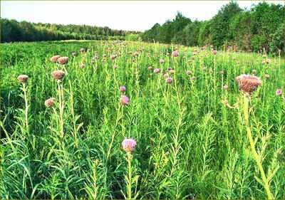 Ботаническая характеристика. Внешне напоминает чертополох. Многолетнее травянистое растение высотой 0,5-2 м. Корневище горизонтальное, ветвистое, с тонкими, густо нарастающими корнями. Стебли многочисленные, неветвистые, опушенные, облиственные, с шаровидной одиночной корзинкой на верхушке. Листья очередные, крупные, перисто-рассеченные, пильчатые по краю. Цветки трубчатые с глубокопятинадрезанным венчиком, фиолетово-пурпурные. Плод — коричневая сухая четырехгранная ребристая семянка длиной 5-8 мм и шириной 2-3 мм с хохолком наверху. Цветет в июле-августе, семена созревают в августе-сентябре. Размножаются корневищами и семенами.