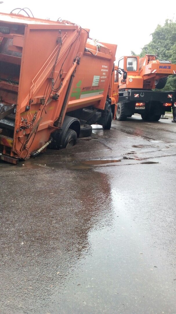 Сегодня около половины 9 утра в переулке Блинова коммунальный КАМАЗ провалился в размытый коллектор.