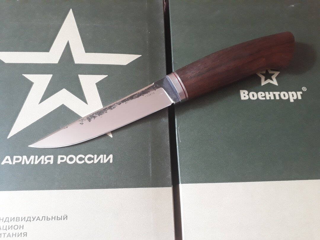 Это нож нашего друга, который он приобрел по бартеру со своей доплатой. В своей статье я хочу поделиться мнением обладателя этого ножа. Было бы не правильно не назвать авторов этого изделия. Итак, клинок изготовлен в мастерской Андрея Бирюкова, а рукоять (и ножны) сделал Дмитрий Шеф. Ножны выполнены из натуральной качественной толстой, но в то же время мягкой и эластичной кожи. Рукоять ножа сделана из ореха, пропитана очень хорошо. За время использования дерево так и осталось насыщенного цвета, без потертостей. Сталь кованая, твердость - 61 по шкале Роквелла. Хозяин ножа использует его в основном на кухне, иногда берет с собой на вылазки по выходным. Нож удобно и плотно сидит в руке, что также немаловажно. И все же для ножа самое главное: - острота, - стойкость к затуплению, - поведение в заточке. Так вот, все эти три пункта оцениваем положительно! На фото ниже видно, что клинок имеет следы ковки, параметры стали и отличительный знак изготовителя, который представляет собой соединенн