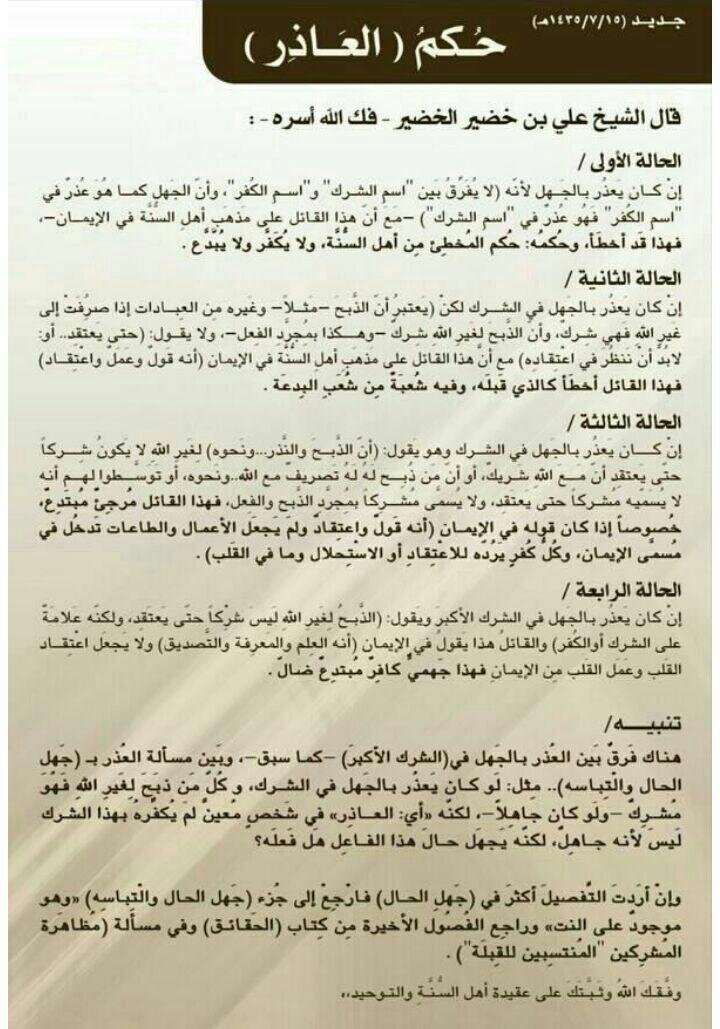 Сказал Шейх Али Аль-Худейр (да освободит его Аллах): Первое положение: Если он оправдывает по незнанию, по той причине, что не делает различие между понятиями «ширк» и «куфр» (1) и полагает, что незнание (может) служить оправданием как в куфре, так и в ширке. Вместе с этим этот оправдывающий на мазхабе «Ахлю-ссунна» в вопросе Имана. Такой ошибся, а его хукм – хукм того, кто ошибся из «Ахлю-ссунна». Ему не делается такфир и его не считают нововведенцем. Второе положение: Если он оправдывает по незнанию в вопросах ширка, но говорит: «Приносить жертву, давать обеты и другие поклонения, которые направляют не к Аллаху – ширк, уже само действие, как приносить жертву и т.п. не Аллаху – ширк», и не говорит, что условием того, чтоб это стало ширком, нужно, чтобы у совершившего его было соответствующее вероубеждение, или, что нужно посмотреть в его вероубеждение в начале (2) (как говорят мурджииты). Вместе с этим он на мазхабе «Ахлю-ссунна» в вопросе Имана, что Иман – это слова, дела