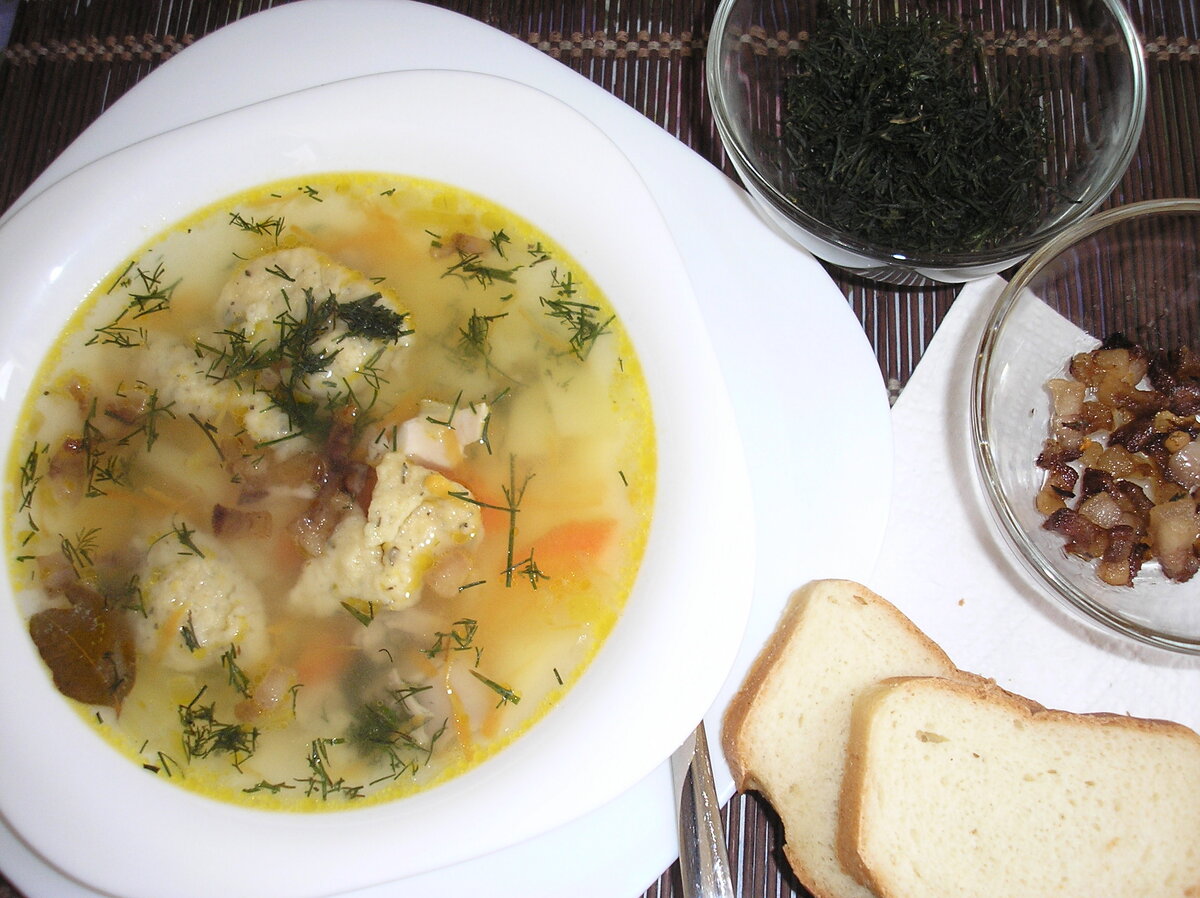 Я не буду учить жену готовить суп с галушками, политически она не готова к такому … Но супчик приготовим в угоду своему пожеланию. Иногда, знаете ли, хочется какого-нибудь извращения кулинарного. Суп с галушками – это очень необычное, но простое в приготовлении блюдо, которое, как они сами считают, придумали украинцы. Но, если обратиться к энциклопедиям, то … Галушки - блюдо восточноевропейской и частично северо-кавказской кухонь, представляющее собой отваренные в кипящей воде кусочки теста. Украинские галушки подают как отдельное блюдо или варят суп с галушками. В Ингушетии есть две разновидности галушек - жур-хьалтамаш и хьор-хьалтамаш. Оба вида обязательно подаются в качестве гарнира вместе с черемшовым или чесночным соусом к мясу. В чеченской, ингушской и балкарской кухнях чаще готовят отварное мясо с галушками. Реже готовят запеченное, жареное мясо или мясо на углях. Во всех видах к мясу добавляют галушки с соусом. Конечно, суп с галушками нельзя назвать диетическим, но с