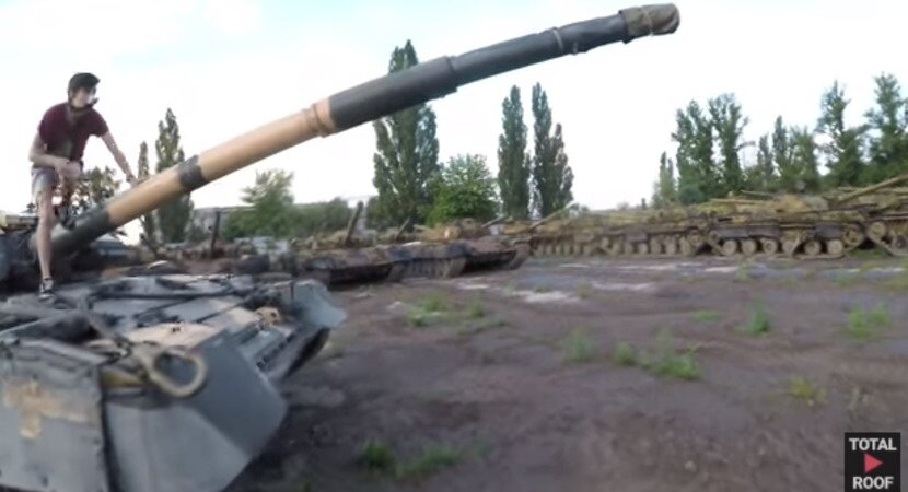 На видео: 300 советских машин и 10 новеньких Т-64 с пломбами в полной боевой готовности, «не считая другого богатства ГО», стоят на заброшенной базе. Два украинских сталкера бродили по полузаброшенным объектам в поисках бункеров или бомбоубежища, но наткнулись на базу боевых машин. Они сняли видео и выложили его на You Tube канал Dima Total.