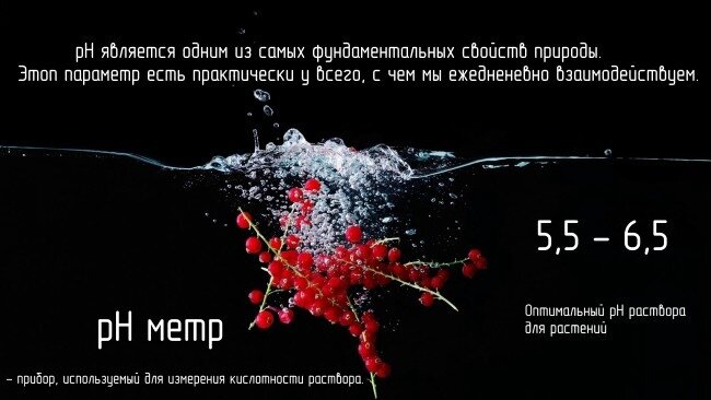 pH — показатель кислотности раствора. Точнее говоря, показатель соотношения кислоты и щёлочи, где 1- кислота, 14 — щёлочь. Определяет способность растения усваивать питательные вещества из раствора.