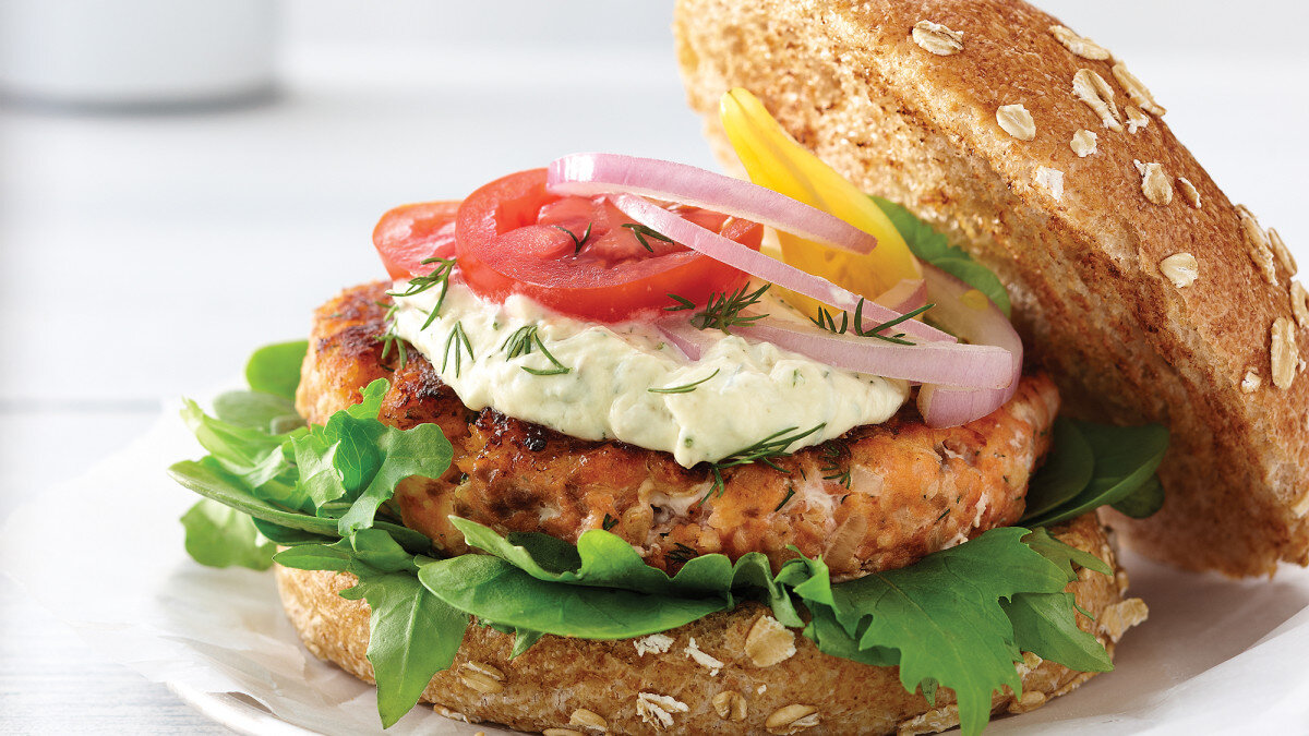 Быстрый, вкусный и питательный способ подачи лосося. Вы можете насладиться этим блюдом в булочке или без, с овощами или салатом Ингредиенты Филе лососи без костей и кожи 560 г. Дижонская горчица 2 столовые ложки Майонез 1 столовая ложка Лимонные сок 1 столовая ложка Тёртая цедра лимона 1/2 чайной ложки Кайенский перец щепотка Луковица, небольшая, 2 шт. Панировочные сухари 1 чашка плюс 2 столовые ложки Соль и молотый черный перец Оливковое масло 2 столовые ложки 4 булочки булочки для гамбургера Соус тартар или соус Руккола или другой листовой салат Помидор Солёный огурец Зелень по вкусу Приготовление: Отрезать три четверти лосося и порубить мелко. Поместите в большую миску. Оставшуюся часть лосося поместите в кухонный комбайн вместе с горчицей, майонезом, лимонным соком, лимонной цедрой и кайенским перцем. Сделайте фарш в комбайне. Соедените фарш с рубленой рыбой. Добавьте мелко порезанный лук, 2 столовые ложки панировочных сухарей, соль 1/2 чайной ложки,зелень и черный перец по в