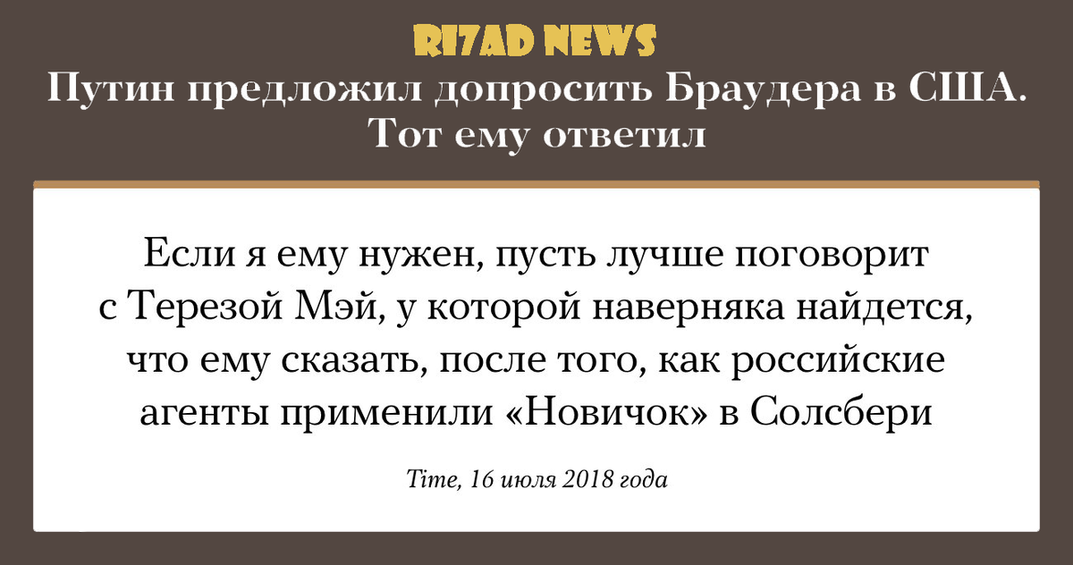 Глава фонда Hermitage Capital Уильям Браудер прокомментировал предложение Владимира Путина провести его допрос в США с участием российских следователей. Допросить Браудера президент РФ предложил на встрече с американским лидером Дональдом Трампом. Браудер в колонке в Time напомнил, что хотя он и родился в Америке, уже почти 30 лет живет в Великобритании и является британским подданным.