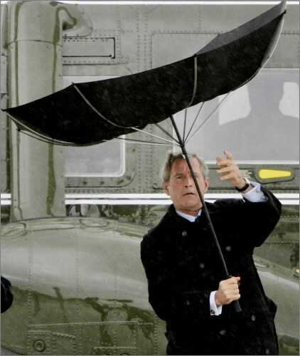 Из американских президентов больше всего досталось от зонтов Джорджу Бушу. В непримиримой борьбе с непокорными зонтиками он частенько терпел поражение.