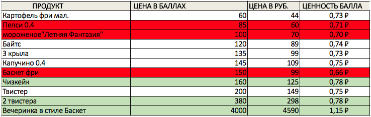 Пригодится эта таблица тем, кто накопил некоторое количество баллов и может выбрать приз из каталога. Таким образом, товары, ценность балла которых минимальна, рентабельне купить, чем обменивать за баллы