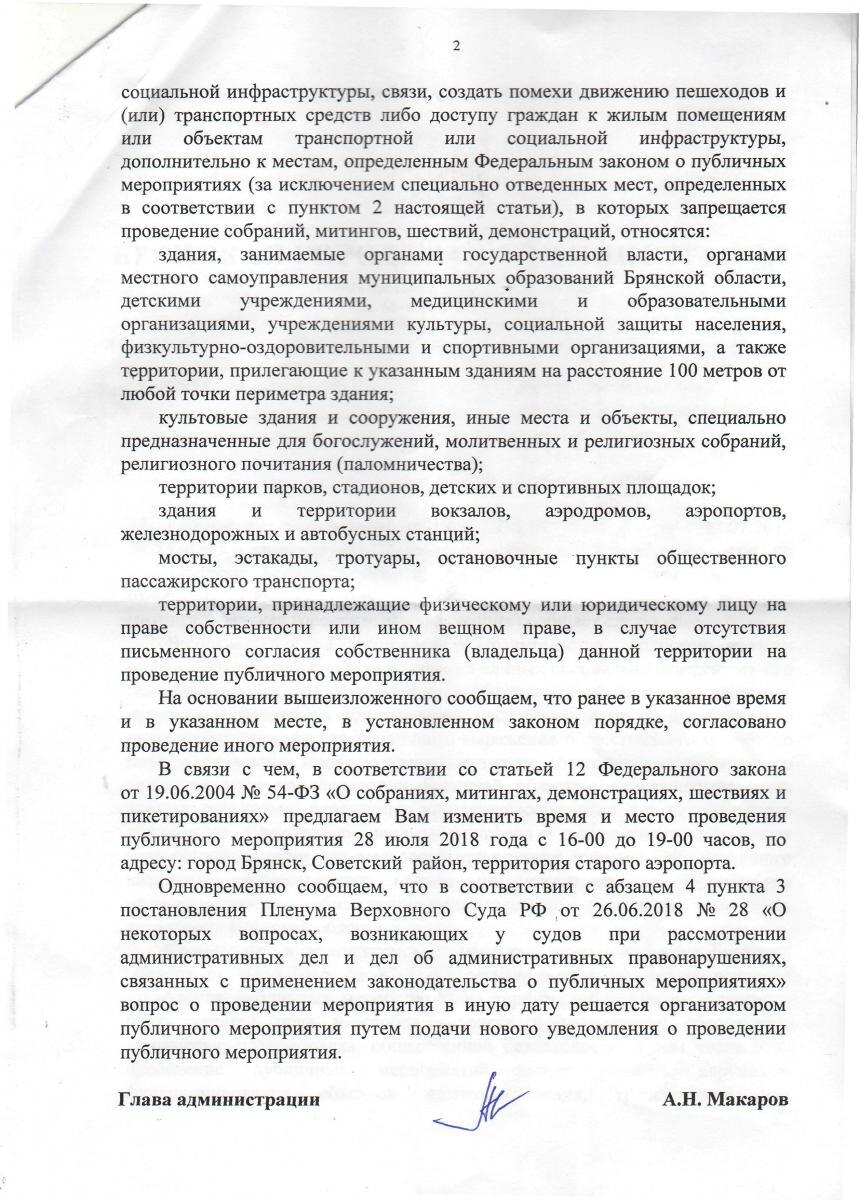 Брянские чиновники не согласовали митинг против повышения пенсионного возраста на Кургане Бессмертия, заявленный организаторами 28 июля с 11:00 до 14:00. Они предложили пренести акцию протеста на старый аэропорт и провести её с 16:00 до 19:00. Решение о том, где именно состоится митинг 28 июля, пока не принято! Напомним, в прошедшую пятницу, 13 июля 2018 года, на заседании Координационного совета по организации протестных действий против повышения пенсионного возраста второй секретарь Брянского обкома КПРФ Андрей Архицкий объявил собравшимся, что коммунисты подали заявку на митинг 28 июля. Акцию протеста запланировали провести на площади возле Кургана Бессмертия с 11:00 до 14:00. А в понедельник, 16 июля, Координационный совет протестных действий подал совместную заявку на проведение митинга. И вот вечером в понедельник, 16 июля пришёл ответ из городской администрации, подписанный А.Н. Макаровым, на первую заявку, отправленную в пятницу. Как и предполагали организаторы митинга, чин