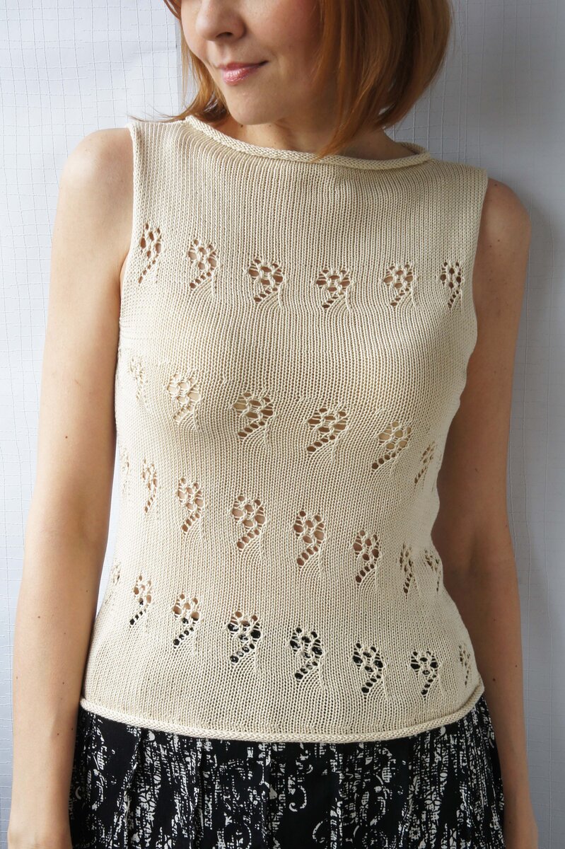 Топик был напечатан когда-то в журнале Любо Дело, и по его мотивам я связала еще и джемпер. Там использован тот же способ частичного вязания, только с другим ажуром. Описание дано для машины 5-го класса, выкройка на размер 42. Для вязания понадобится 4 моточка 100% шёлка Premium silk (СЕАМ), 50г/185м. Петельная проба Пг 2.6 п/см, Пв-3,6 р/см. Выставить иглы в рабочей зоне 54-0-54, набрать петли приемом «косичка» на плотности PL6, провязать 10 рядов кулирной глади (рулик). Далее на рабочей плотности PL5* провязать прямо 8 рядов кулирной гладью. Настроить машину на ЧВ (иглы в ПНП не вяжут), вывести в ПНП со стороны противоположной каретке 18 раз по 6 петель в каждом втором ряду (-18х6*2 ЧВ). Настроить машину на работу с узором в режиме деккеровочного ажура. Далее вязать следующим образом: *16 рядов ажурный узор, 24 ряда кулирная гладь*. От * до * повторить 3 раза. На высоте 120 ряда настроить каретку на ЧВ, вывести в ПНП все иглы и далее вязать удлиненными рядами, вводя 18 раз по 6 пе