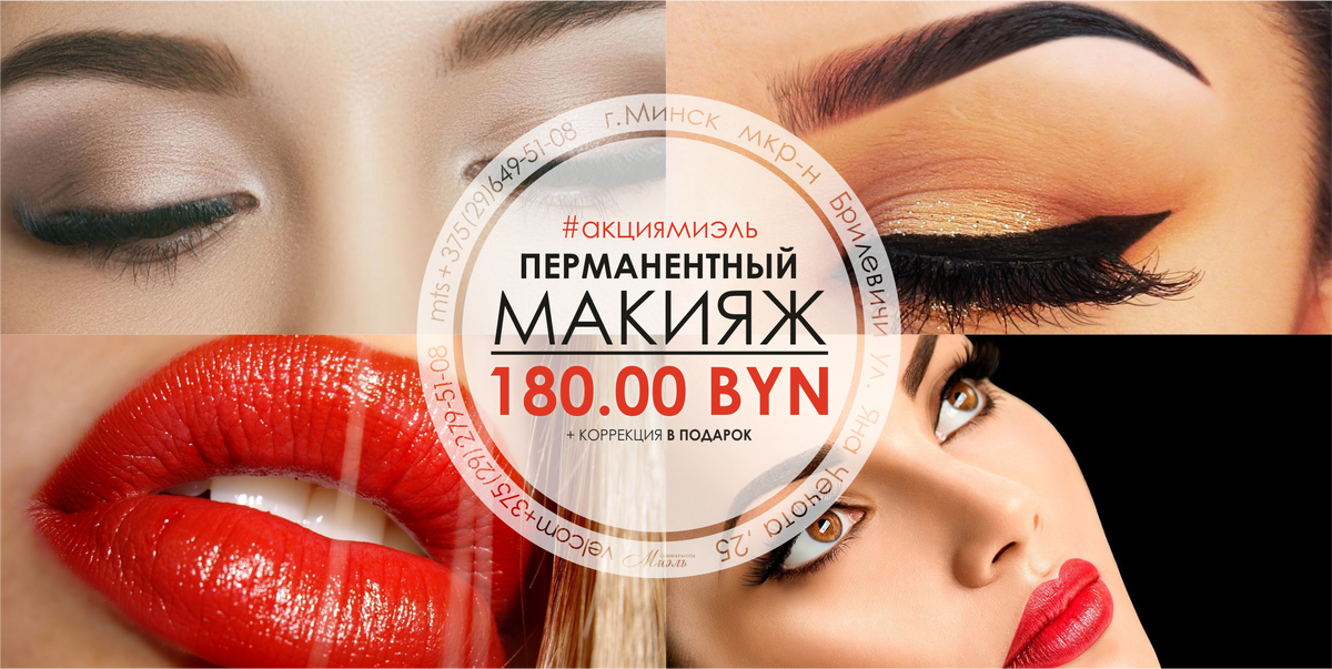 Вы любите делать утром макияж в спешке или на бегу? А ближе к вечеру волноваться, сохранил ли он свою форму и свежесть? Если ответ "Нет", то тогда это для Вас. Современная косметология позволит Вам избежать многих переживаний и всегда быть уверенным в своей привлекательности. И перманентный макияж (татуаж) – одна из тех процедур, которая придаст Вашему лицу желаемую выразительность и яркость. В июле салон красоты "Миэль" проводит очень выгодную акцию для Вас! Не пропустите! В чем заключается процедура перманентного макияжа? В ходе процедуры перманентного макияжа (татуажа) в верхний слой кожи вводятся специальные пигменты, которые позволяют подчеркнуть, скорректировать черты лица или имитировать обычный макияж. Пигменты сохраняют свою яркость в течение нескольких лет – а вы идеально выглядите в любое время дня и ночи. Важно знать! В первые дни перманентный макияж выглядит намного ярче. Не пугайтесь – так и должно быть, нужно подождать к