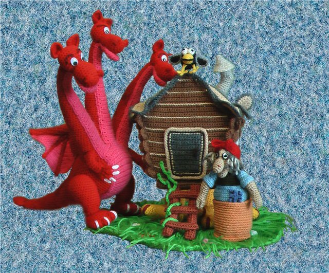 гостей, поспешил открыть дверь и не спросил «Кто?». Увидев супостата-похитителя, богатыри кинулись на него. Уже через секунду Горыныч был придавлен головами к полу, руки, ноги и хвост ему связали за спиной. Завязали ему и два рта, так чтобы он мог говорить только одной головой. На шум прибежала Людмила.