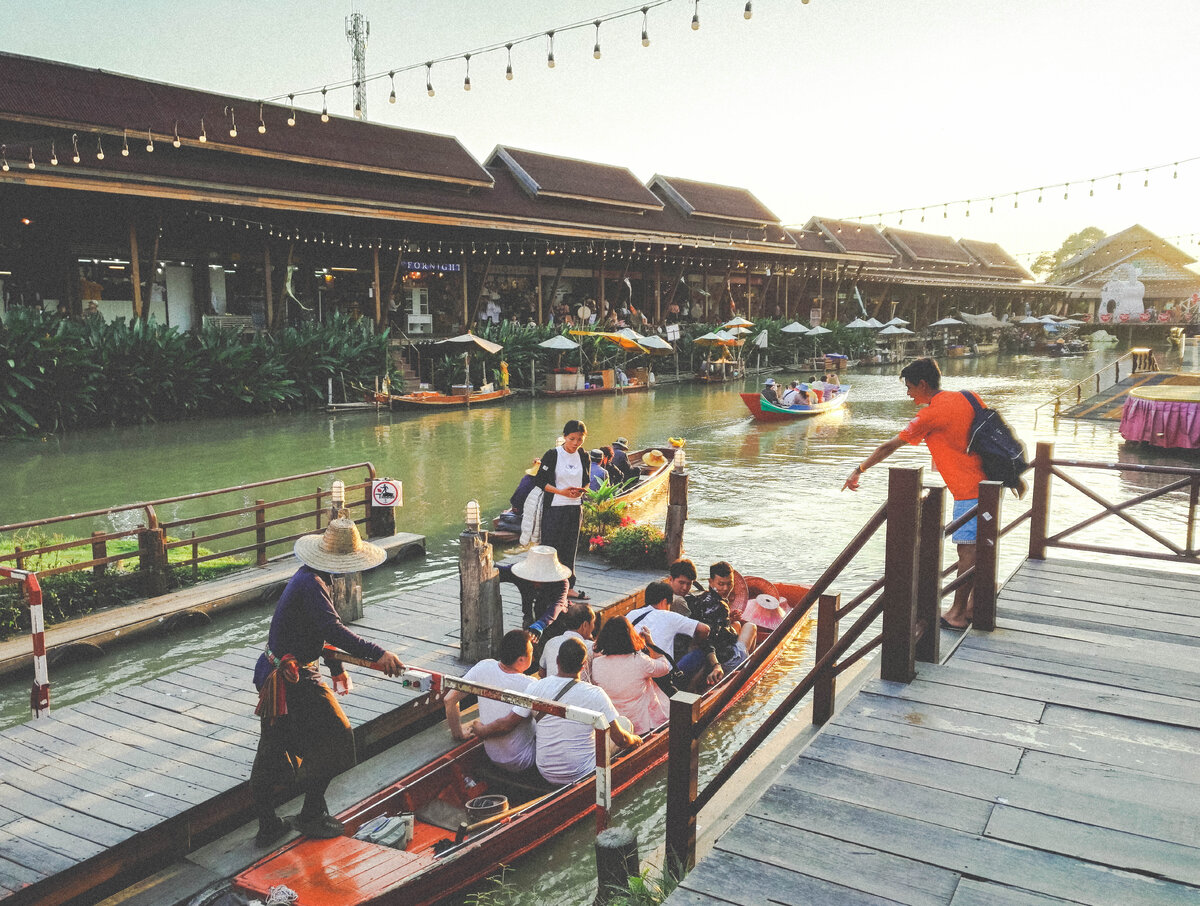 Вначале мы хотели съездить в Тигровый зоопарк на Сукхумвите. Доехали на такси, зашли, посмотрели цены. Потрогать тигров около 2000 бат, потрогать тигрят 1800 бат, на все про все 10 минут. Я обожаю тигряток, львяток и слоняток, но не за 4000 рублей с человека! А нас было трое. Сервис в этом парке тоже слабоват, ничего толком показать и объяснить не сумели. Поэтому мы перешли шоссе по пешеходному мосту и дошли пешком до Плавучего Рынка. Вход в него сделан в виде корабля, смотрится внушительно, точно не пропустишь его. Касса находится справа, если смотреть на корабль с дороги, цена около 400 бат с человека. Мы прошли внутрь корабля через турникет и попали в небольшой храм внутри помещения. Ну а дальше вышли на улицу и попали на территорию плавучего рынка. Почему он плавучий? Потому что находится на говно-речушке с понтонами и мостами, а по говно-каналам ходят лодочки с прилавками. Это как макашницы, только на воде. Внутри лодок сидят тайские бабули и жарят креветочки, осьминоги на грил