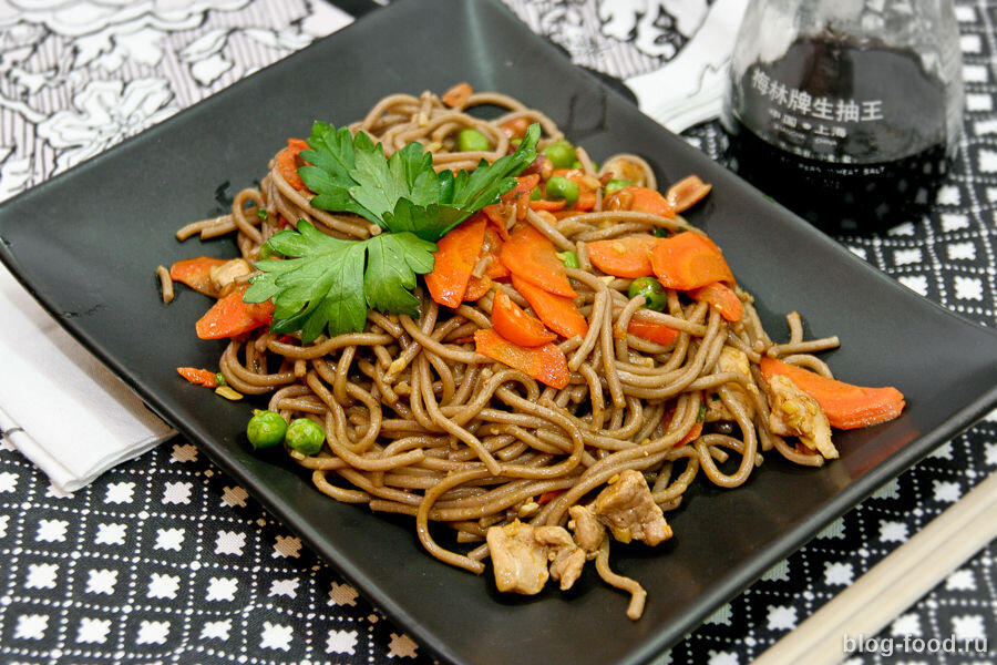 Сегодня у нас японский гость, а точнее, гостья — японская гречневая лапша Соба, история которой имеет древние корни. Не будем углубляться в хитросплетения эпох замечательной родины этого продукта, заметим лишь, что Соба — штука очень вкусная, питательная и полезная. Сочетается практически со всеми продуктами, а главное, с мясом, что нам как-то ближе, нежели поливать её бульоном или сдабривать поджаренной корочкой тофу )).