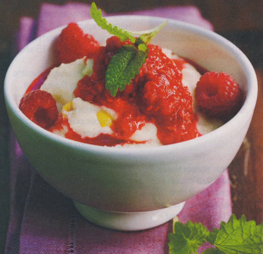 Ингредиенты: 2 столовые ложки манной крупы, 2/3 стакана молока, 2 столовые ложки сливок 10 % жирности, 200 гр. свежей или замороженной малины, 1,5 столовые ложки сахара, 1 щепотка соли, 1 щепотка ванильного сахара, листочки мяты для украшения Способ приготовления: В кастрюле на плите довести до кипения молоко, добавить в молоко сахар, соль по вкусу. Не прекращая помешивать, постепенно высыпать манную крупу. Мешать и варить кашу приблизительно 15 минут на слабой мощности плиты. Свежую малину вымыть, обсушить на бумажном полотенце. Если берёте замороженные ягоды малины, то их необходимо разморозить и сок, который образовался при размораживании нужно слить, чтобы не было жидкости в ягодах. В отдельную чашу отложить 7 ягодок для украшения. Оставшиеся ягоды взбить с помощью блендера до однородной консистенции. Дополнить консистенцию ванильным сахаром, а затем протереть массу через сито. Кашу выложить в глубокую тарелку, украсить сливками, ягодной массой и 7 ягодками малины, листочками мяты