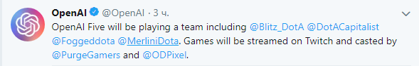 Компания OpenAI несколькоми часами ранее в своем официальном твиттер-аккаунте поделилась новостью, что разрабатываемые ей боты сыграют против команды людей. Как уверяют разработчики, игра будет проходить в формате bo3. Также, они заявили, что боты играют на 18 героях, а время их реакции увеличилось c 80 до 200 мc ( приблизительно как и у человека). Пока что известно, что команду людей будут представлять Blitz, Fogged, Merlini, Capitalist. Кто будет 5 игроком - неизвестно. Игру ботов против людей можно будет наблюдать на официальном twitch-канале разработчиков.