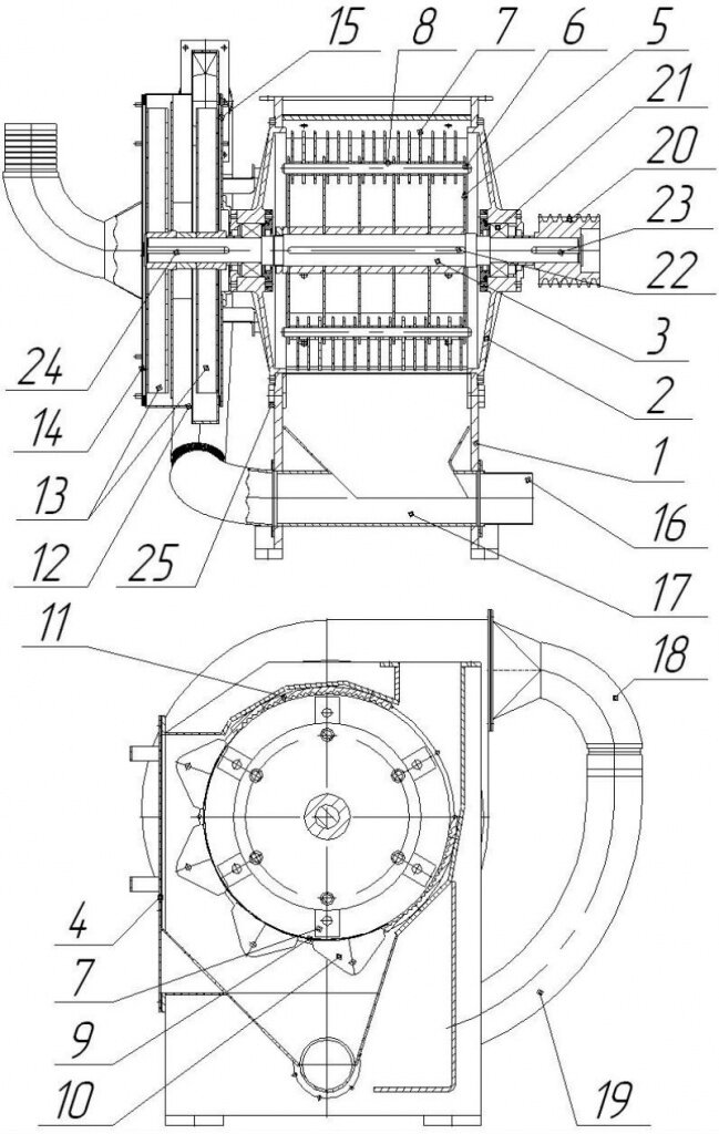 1 – корпус; 2 – крышка боковая; 3 – вал; 4 – крышка; 5 – диск; 6 – палец; 7 – молоток; 8 – втулка распорная; 9 – решето; 10 – прижим; 11 – дека; 12 – кожух вентилятора; 13 – роторы; 14 – крышка передняя; 15 – крышка задняя; 16 – патрубок; 17 – труба; 18 – патрубок; 19 – шланг; 20 – шкив; 21 – подшипник роликовый сферический двухрядный 3610 ГОСТ5721-75; 22 – шпонка 18х11х388; 23 – шпонка 14х9х56; 24 – шпонка 14х9х90; 25 – эксцентрик.