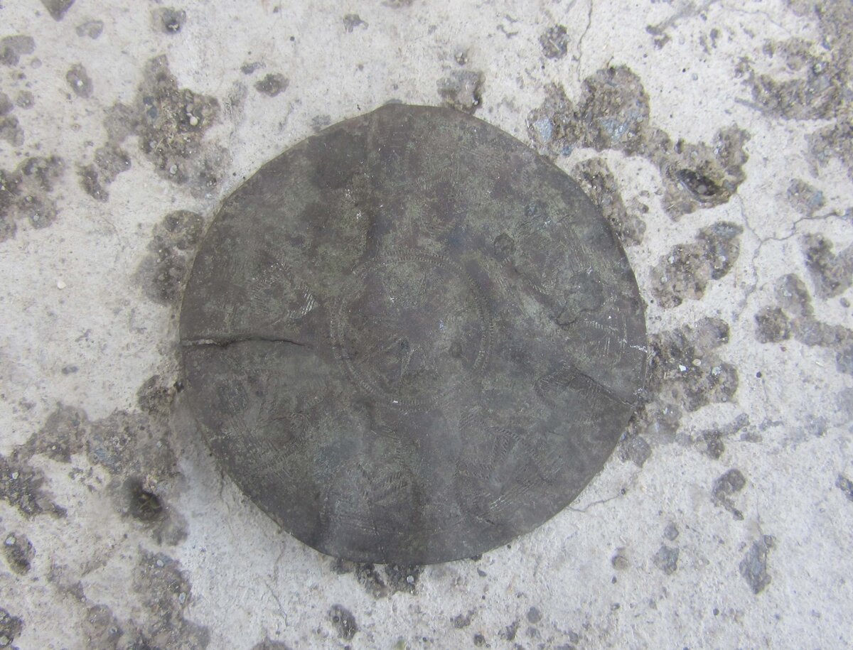Уже давно валяется у меня кругляш с очень непонятным орнаментом. Орнамент я разглядел, лишь помыв этот предмет. Диаметр - около 5 см, пластинка очень тонкая (всего около 0,3-0,5 мм), материал определить сложно, но похоже, что медь. В фотошопе попытался увеличить контрастность, чтобы можно было разглядеть рисунок. В центре четко видно подобие солнца, а по краям находятся одинаковые рисунки. Я насчитал их 8 штук. Если взять за основу солнце, то это что-то типа солярного амулета, может быть украшало одежду или какой-нибудь предмет. А может быть все намного проще - какая-нибудь накладка на сундук, а орнамент мастер просто выдумал без всяких потайных смыслов. На оборотной стороне нет никаких следов от крепления, она абсолютно гладкая.