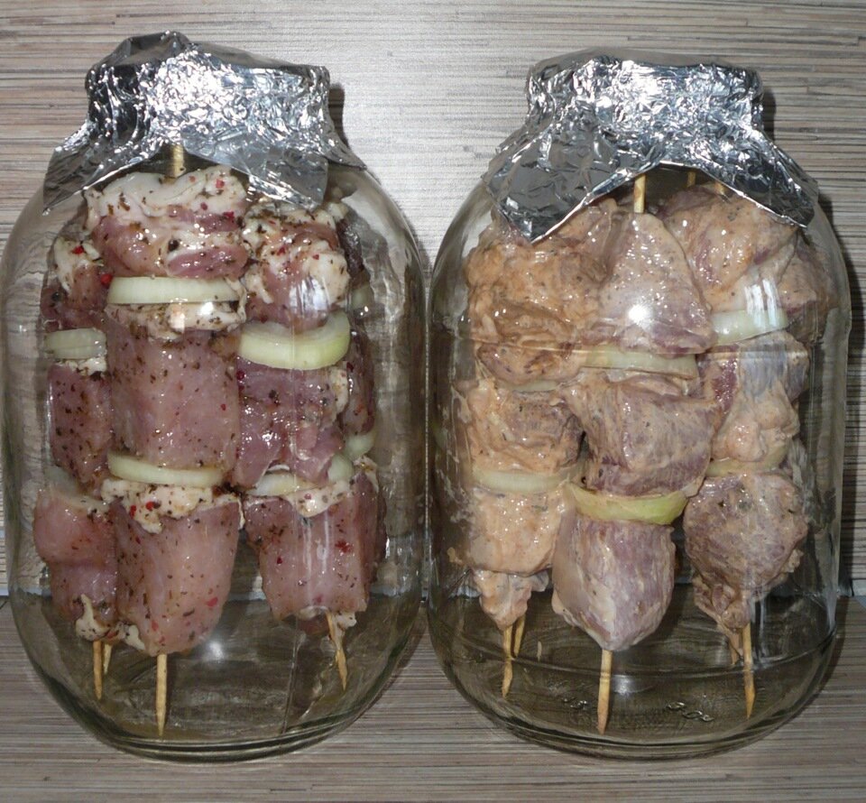 Уж на что я искушенная в вопросах кулинарии, но такого дива не видела. Друзья попробовали – получается даже вкуснее обычного способа. Приготовление: Этот рецепт называют шашлыком для непогоды. Потому что мясо готовим… в банке! Некоторые даже советуют добавить жидкий дым, но это на любителя. Сам способ приготовления абсолютно безопасный, главное соблюдать инструкции. Поначалу как обычно маринуем мясо. На 500 грамм свинины берем столовую ложку лимонного сока, 100 миллилитров минералки, 2 столовых ложки уксуса. Посыпаем специями, солью и перцем и добавляем лук, порезанный на кольца. Оставляем мясо мариноваться на час Также потребуются деревянные шпажки, их следует обломать под размер банки. Нанизываем на импровизированные шампуры свинину вперемежку с луком. Делаем крышку из фольги. Обязательно! Ставим сосуд в холодную духовку и уже потом разогреваем. Запекаем при температуре 180 градусов около часа. По готовности открываем духовку и оставляем минут на 15, чтобы банка остыла и не лопнула.