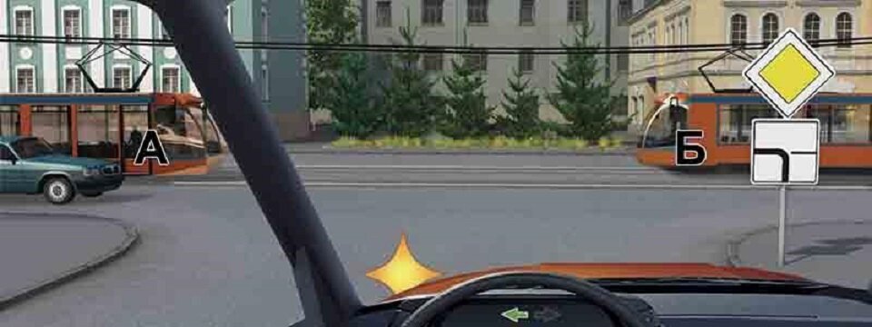 Билет 3 Вопрос 15. Кому Вы обязаны уступить дорогу при повороте налево? 1. Трамваям А и Б. 2. Трамваю А и легковому автомобилю. 3. Только трамваю А. 4. Никому. Условия задачи: Водителю автотранспортного средства, от лица которого мы наблюдаем за окружением, стоит задача пересечь перекресток и повернуть налево. При этом перед нами потенциальные помехи: водитель легкового автомобиля слева, который, судя по отсутствующему сигналу поворота, собирается ехать прямо, и два трамвая, движущиеся навстречу друг-другу. Перед нами нет светофора или регулировщика, а из дорожных знаков доступны лишь: знак 2.1 "Главная дорога" и 8.13 "Направление главное дороги". Направление нашего движение совпадает с направлением главной дороги. Решение: Проезд перекрестков регламентируется главой 13 ПДД. В силу отсутствия светофора или регулировщика перед нами нерегулируемый перекресток. Наличие перед перекрестком знаков приоритета говорит о том, что это перекресток неравнозначных дорог. Двигаясь на данном пе