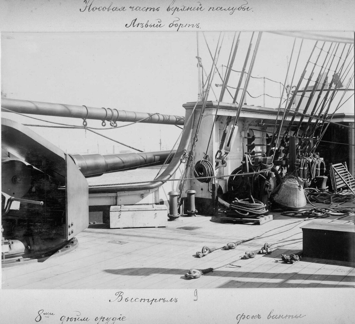 Прекрасный кадр , достаточно известный в узких кругах - носовое 8-дм в 35 калибров орудие левого борта крейсера 1 ранга "Рюрик". Интересна и вся корабельная "мелочёвка" по борту , особо любопытно размещение за вантами на фальшборте подвески артиллерийских принадлежностей - банника , гандшпуга и ещё чего-то , ну и ящик перед орудием для первых выстрелов! Так же прекрасно видно , что настил палубы перед орудием заканчивается и переходит в более крупные и толстые брусья на которых уже и стоит сама пушка.