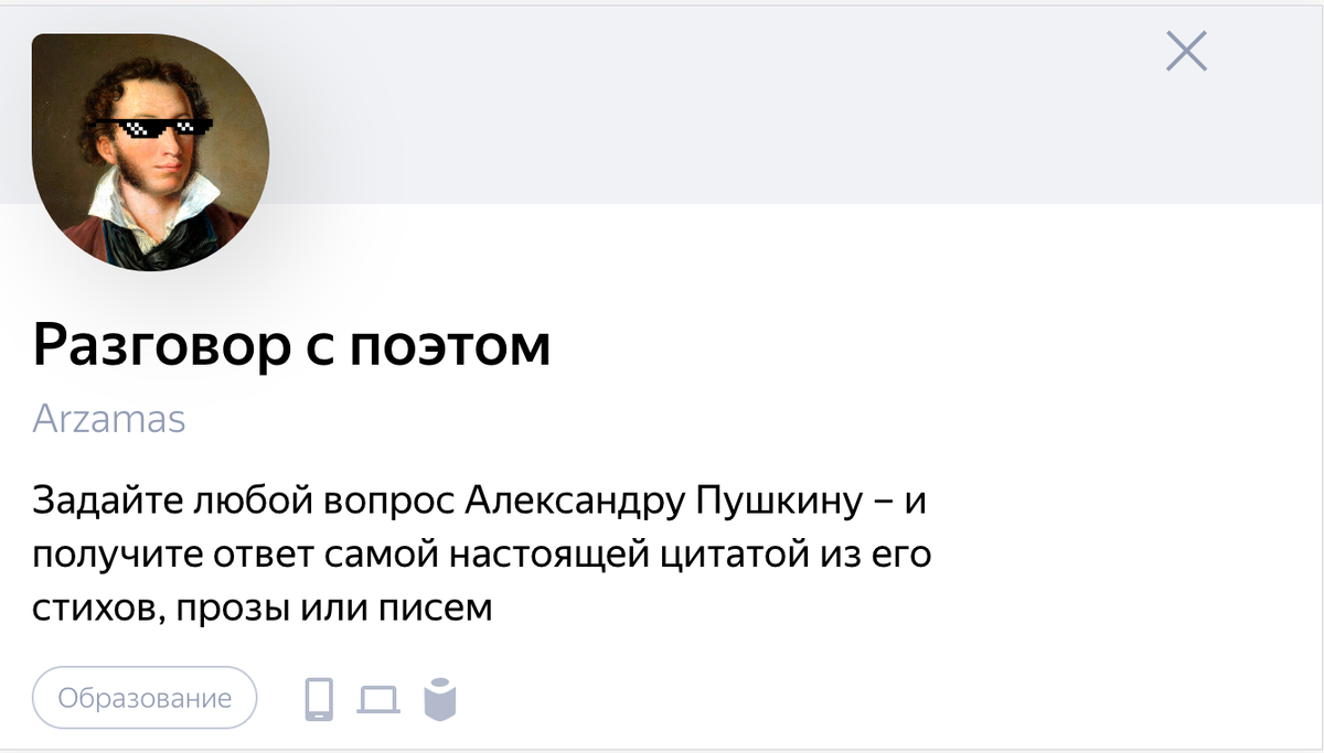 Категория: Образование Хотели бы Вы когда-нибудь поговорить с самим Александром Сергеевичем? Алиса делает возможным чат с Пушкиным, в рамках которого поэту можно задавать любые вопросы, делится своим мнением. Виртуальный А.С. Пушкин отвечает цитатами из своих произведений. Увлекательный диалог позволит ближе познакомится с произведениями литературного гения. Как активировать навык и воспользоваться им? 1) Обратиться к Алисе с командой «Запусти навык разговор с поэтом» или «Запусти чат с Пушкиным»; 2) Задать вопрос А.С. Пушкину, поделиться мыслью, попросить совета. Ссылка на страницу навыка: https://dialogs.yandex.ru/store/skills/c8919996-razgovor-s-poetom