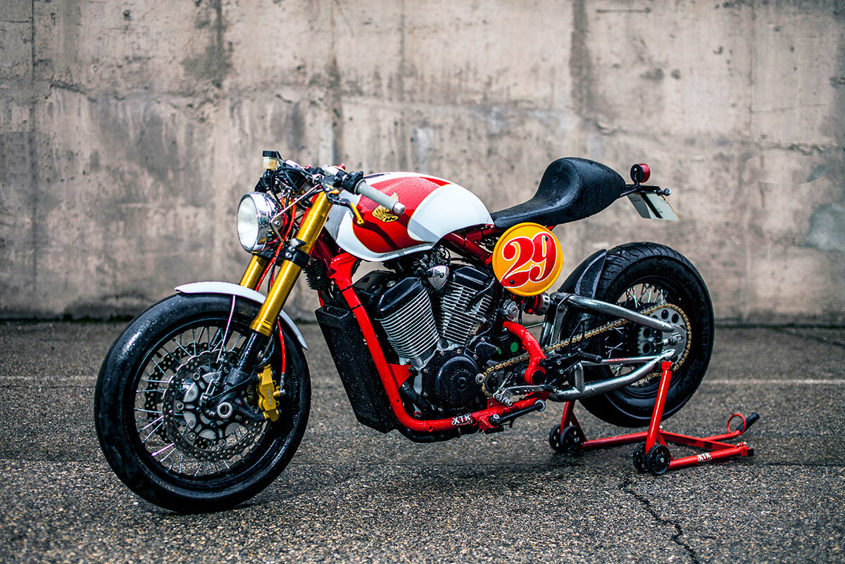 Можно ли подумать, что перед нами самая обычная Хонда Шэдоу? Да-да, тот самый чоппер, который часто берут себе байкеры в качестве первого мотоцикла. Pepo Rosell, похоже, работает по 25 часов в сутки: примерно раз в месяц выпускает новый кастом. И этот, специальный Spitfire Special, абсолютно блестящая модель! В отличие от мотоциклов, которые выходят из мадридского гаража, этаот кастом не отдает дань уважения гонщику из прошлого. Вместо этого Пепо объединился с испанским поставщиком запасных частей для переделки этого Honda Shadow 400. Я говорю о б/у запчастях, потому что почти все запчасти на Spitfire были приобретены на Motostion. Например, вилки от ZX6R, бак Yamaha YBR125. Gixxer и фара от Mash 125. Конечно, речь идет намного больше, чем о просто подстановке новых запчастей. Пепо изменил раму, исключив ненужный металл, чтобы получить более гоночный профиль. Даже заимствованный бак подвергся довольно сильному изменению, чтобы вписаться в проект.. А вот сиденье, например, собствен