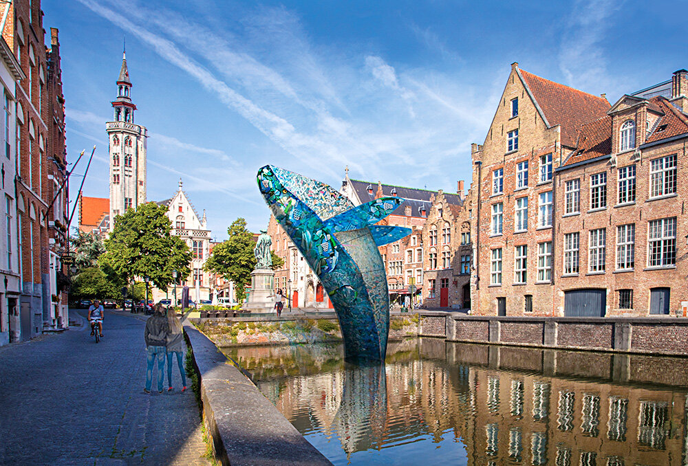 В Брюгге, появилась огромная скульптура синего кита, которая создана из морского пластика. Поводом для такого перфоманса послужила экологическая ситуация в Бельгии. По последним данным в главном речном канале Брюгге содержится около пяти тонн пластика. Собранный пластик принял форму гигантской скульптуры кита высотой с четырёхэтажный дом. Арт-объект был создан архитектурно-дизайнерским бюро STUDIOKCA, которое ранее представляло конструкцию Head in the Clouds, состоящую из многочисленных пластиковых бутылок, выбрасываемых в Нью-Йорке каждый час. Скульптура Skyscraper (the Bruges Whale) стала самым амбициозным проектом бюро на сегодняшний день. Бруклинская команда дизайнеров решила обратить внимание на огромное количество пластика, который скапливается в так называемых «жидких городах» (англ. Liquid Cities). Вместе с фондом Hawaii Wildlife, компания STUDIOKCA в течение четырёх месяцев собирала пластик, чтобы построить гигантского кита, который смотрит на знаменитую площадь Яна ван Эйка