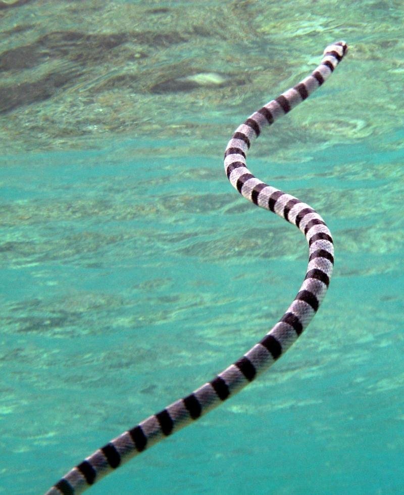 Для многих не секрет, что змеи любят воду, многие виды охотятся на рыб или предпочитают жить у воды. Однако существует подвид змей, которые выбрали соленую воду, как единственное место обитания. Этот подвид аспидов называется Hydrophiinae. Существует более 55 видов морских змей, длина их достигает 2-3 метров, местом их обитания является тропические воды Индийского и Тихого океана. Иногда змеи заплывают дальше на север, но такие случаи единичны. В чем же их опасность? В эволюции! Когда-то предки этих змей решили поплавать в море, там они нашли множество еды, которая не была приспособлена к их методам охоты. С тех пор начался процесс приспособления. Одно легкое атрофировалась, зато второе разрослась во всю длину тела, хвост сплющился, появилось некое подобие плавников. Вместо жабровидных отростков у змей выработался уникальный, больше нигде не встречающийся, фильтр в слизистой оболочке. Он позволяет всасывать кислород прямо из воды. Однако опасность представляет улучшенный яд этих зм