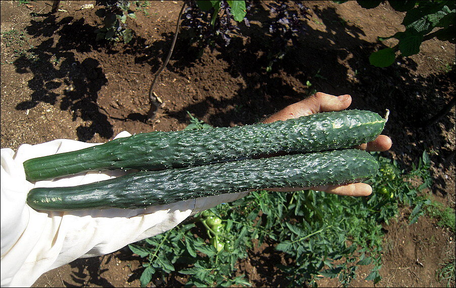 Полив и ещё раз полив. Странное свойство почвы у меня - никакого намёка на песок, а сунешь через пару дней после полива пальцы в лунку - и практически сухая земля на всю глубину. К середине дня болгарские перцы вешают уши. Но помидоры и огурцы Китайские жаростойкие держатся молодцом. Вот какие поленья вырастают: Я уже писал, что кто-то подгрызал молодые огуречные всходы и что я обложил оставшиеся и вновь посаженную рассаду сосновой хвоей. И знаете, ни одного погрыза больше. Склоняюсь к мысли, что может, это слизни безобразничали, им через хвою хода нет, конечно. Пообломалось несколько ответвлений у крупноплодных томатов. Никогда у меня не было столь мощных кистей с плодами, вот и прозевал. Вчера нарезал стоек и подвязывал помидорные кусты, заодно обламывая пасынки. Каждый день выношу с участка абрикосы и алычу, а вчера на соседнем брошенном участке созрел инжир, он же фига, он же смоковница: Дополнительно подсеял кинзу и укроп на замену перезревающим. И разродилась наконец вигна, заб