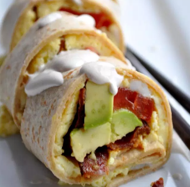 Возьмите кружочек из лаваша сверху положите блин потом 2 полоски бекона, нарезанное авокадо и помидор. Сверните как можно крепче и нежно. Подождите немного, а затем нарежьте острым ножом в ролы. Повторите весь процесс.