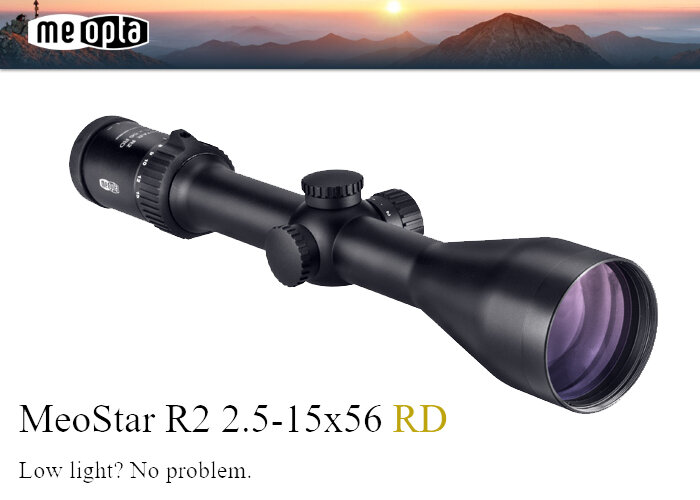 Meopta выпускает новый охотничий оптический прицел MeoStar R2 2.5-15x56 RD, нацеленный на короткие и средние дистанции, с высоким потенциалом использования в условиях недостаточной освещенности, благодаря большому диаметру объектива и высококлассной оптике. Покрытие MeoLux на линзах изготовленных из высококлассного стекла Schott, обеспечивает 95% светопередачу для использования даже в сложных погодных условиях с недостаточной освещенностью, вроде раннего рассвета и наступающих сумерек. В дополнение к нему - внешнее гидрофобное покрытие MeoDrop, отталкивает снег, грязь, масла, грязь, воду, а также ионное покрытие MeoShield, защищает от абразивных повреждений. Цельная 30 мм основная труба из алюминиевого сплава и весь прицел покрыты закаленной анодировкой для максимальной защиты от износа. Универсальное шестикратное оптическое увеличение с 2,5 до 15 крат с четырьмя подсвечивающимися перекрестиями на выбор: C-RD, 4K-RD, BDC 2 и BDC 3, позволят использовать прибор на небольших и на дальни