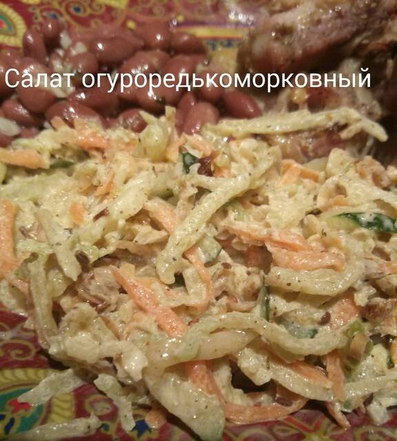 Немного шутливый, праздничный и вкусный рецепт Ингредиенты Приготовление Лук тонко нарезаем, обжариваем на растительном масле. Овощи режем или натираем на длинные брусочки, соединяем, добавляем специи, даем промариноваться 15 - 30 минут, сливаем рассол, добавляем жаренный лук и жаренные тыквенные семечки, заправляем майонезом, убираем в холодильник настоятся. И будет нам вкусно!!!